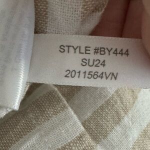 Perfect for the summer. Tan and white striped pattern. Side pockets. Elastic waist with drawstring.