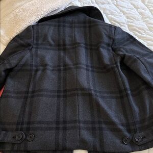 Brand new and timeless. Double breasted in dark charcoal with navy blue plaid. Long sleeves. Regular relaxed fit. Two hand pockets. Wide collar classic style. Warm and year round style.