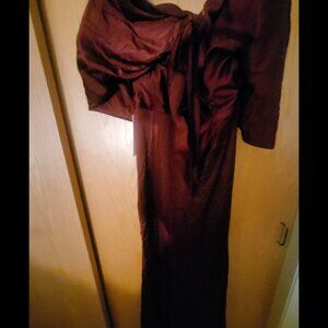This is a burgundy cowl neck off-the-shoulder formal gown