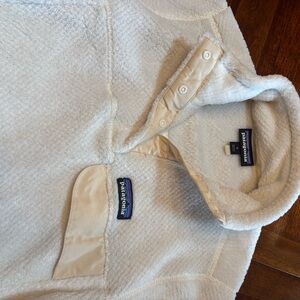 Soft off-white fleece pullover by Patagonia. Features a button-up collar and front pocket.