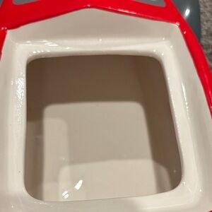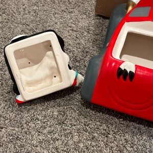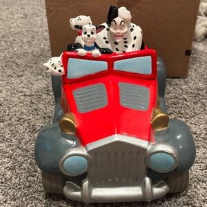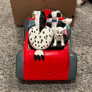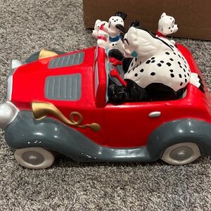 Vintage Charming Disney ceramic car with Dalmatian figures. Features vibrant red and gray colors. Ideal for collectors and fans.