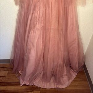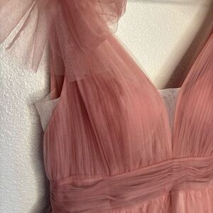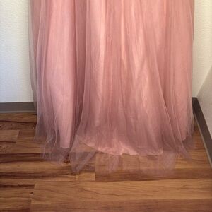 This gown exudes timeless elegance with a deep V-neckline accentuated by delicate tulle bow details at the shoulders, evoking a dreamy and feminine allure. The fitted bodice gracefully cinches at the waist, seamlessly transitioning into a voluminous A-line tulle skirt that embodies both drama and sophistication. The deep V-cut back adds a hint of allure, while the soft tulle bow accents at the shoulders infuse a romantic and ethereal charm, completing the gown’s enchanting silhouette. Color: Dusty Rose