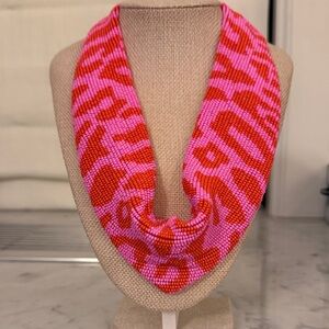Elegant beaded scarf necklace with a vibrant pink and red design in a geo/leopard pattern. Perfect for adding color to your outfit. This is the “Charlotte” smaller version of the scarf necklace, measures 4” at the widest part. Head beaded seed beads on silk chiffon. Perfect condition.