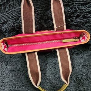 Stylish and vibrant, this Coach tote bag features a striking pink and brown color combination. Perfect for adding a pop of color to any outfit. Pre-loved item, please see photos for flaws. Have not attempted to clean