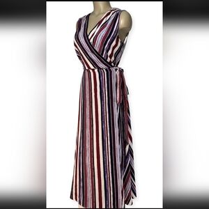 Elevate your style with this chic sleeveless wrap dress. Featuring a striking striped pattern in red, blue, and white, this dress is perfect for any occasion. The wrap design offers a flattering fit.