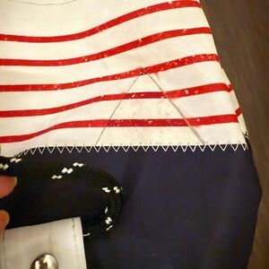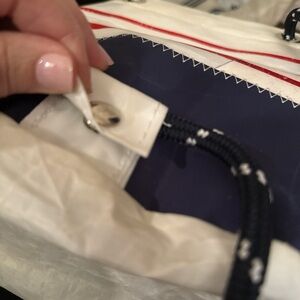 SEA BAGS of MAINE made of retired boat sails from the working waterfront of Portland, Maine. This is a backpack but with back snap could be configured to a shoulder bag. Mariner red stripe design. Inside zip pocket. Snap top closure. All grommets in place and bag is in great condition. Made in Maine. (1078) approx 11”x10”x5” Retails for $175 #boating #sailing #sailor #boatsails #fishing