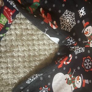 Celebrate the season with these festive leggings. Features snowmen, gingerbread, and holiday patterns. Perfect for adding cheer to your wardrobe. The gingerbread have a navy background and are like new, second pair are snowmen with a black background these are in excellent condition with some light wear in thigh area, 3rd pair is a black background with Christmas sweaters pattern, these are NWT. They are all the buttery soft legging material.