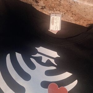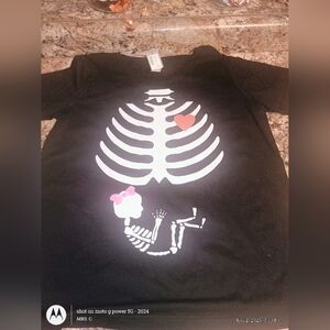 Black tee with playful skeleton design. Features heart detail. Perfect for fun style.Pregnancy Halloween shirt Halloween costume pregnant for pregnant with a. brand new with tags retail value $30 made for 100% cotton bab skeleton maternity shirt