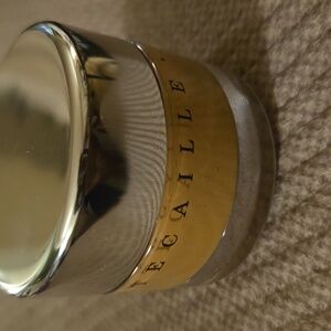 Elegant Chantecaille jar with a metallic silver lid. Cream-colored base for a sophisticated look.