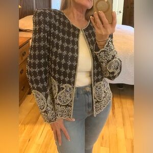 Bring back the 80’s with an update in this gorgeous beaded jacket from Silky Nites by Cherish! The bead work on this jacket is incredible. It is so intricate and absolutely swimming in beads! There are so many ways to wear a vintage piece like this. Of course, you can wear it over a sexy, body con dress, or dressy slacks. But try it over a pair of faux leather pants, or your favorite pair of jeans for a trendy twist! This 40 year old piece is in beautiful vintage condition.