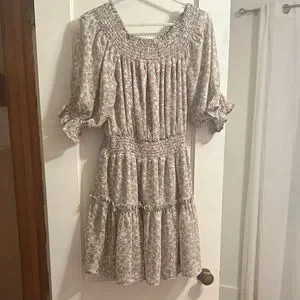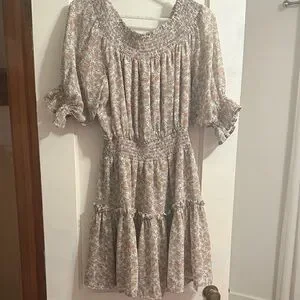 Elegant long sleeve dress with floral pattern. Smocked bodice and ruffled hem. Ideal for versatile styling.
