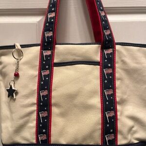 The Joe Boxer Canvas Shopper Tote is a perfect carry-all. A large rectangular tote bag designed for travel or casual use, you will find yourself using it every day. It features patriotic red, white, and blue accents such as straps with flags and stars, making it perfect for a patriotic or beach-themed style. The exterior is cream-colored with a zip closure, inner pockets, and a shoulder strap handle for convenience. This Americana-themed tote is brand new without tags, adding a touch of patriotism to any outfit.