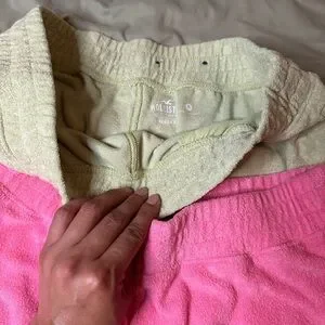 Vibrant pink and soft cream shorts. Ideal for workouts or lounging. Comfortable fit. Terry cloth material with pockets. The green is a bit brighter in person.