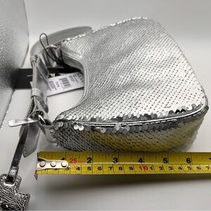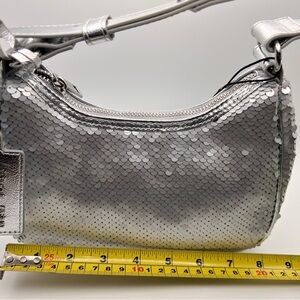 Shimmering silver sequin shoulder bag perfect for adding a touch of glamour to any outfit. Ideal for evening events or a night out.