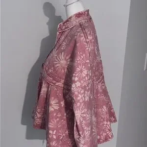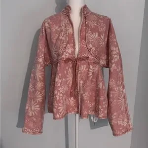 Faded flowers bloom upon this pure cotton denim jacket designed in a slouchy babydoll silhouette. NWOT, never worn. Excellent condition. Tie front, mandarin collar, 100% cotton. Color: faded pink.