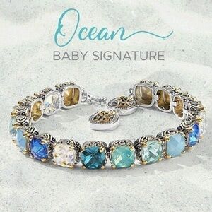The baby signature bracelet in our Ocean hue is created with over 40 carats of sparkling ombre blue crystals and opal czs. The variety of blue hues include; blue opal, aqua, mint opal, turquoise and opal. This bracelet is a stunner. Measuring 7 ¼" Long