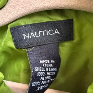 Vibrant puffer vest by Nautica. Features green and pink color scheme. Perfect for adding a pop of color.
