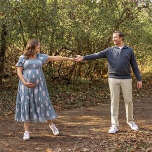 Elegant blue midi maternity dress with white floral pattern. Features puff sleeves and flowing skirt. Perfect for any occasion. Great condition. Smoke free home.