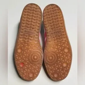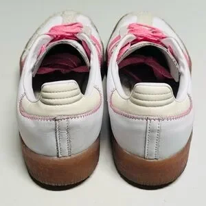 Stylish Adidas Samba sneakers for women. Features white leather with pink accents. Comfortable and trendy. Gently worn, great condition! Retails for $120.