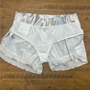 These shorts are designed for running and feature a marble/swirl pattern with a subtle rainbow sheen. They are made with a Recycled Featherweight Stretch fabric and it features like a built-in brief, a zip pocket, and targeted mesh for ventilation.