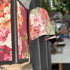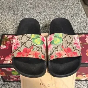 Elegant Gucci slides with floral print. Features iconic GG pattern. Comfortable black sole. 100% authentic, comes with box and one shoe bag. Size 37