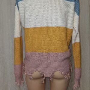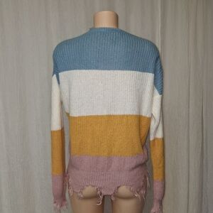 RUNWAY 7 women size m Add vibrant style to your wardrobe with this colorful distressed sweater. Featuring a blend of blue, white, yellow, and pink, it's perfect for casual outings.