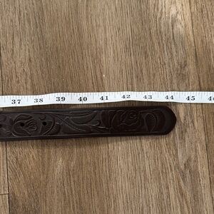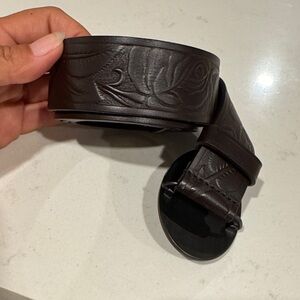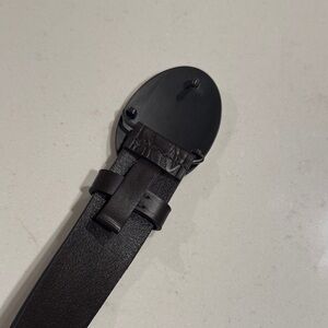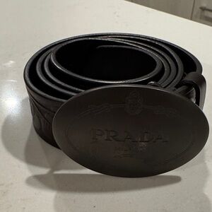Sleek Prada belt in brown leather. Features a bold logo buckle. Perfect for modern style.
