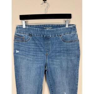Chicos jegging ankle jeans in a medium wash blue denim. These pants feature a comfortable pull-on waistband with belt loops and functional front and back pockets. Subtle distressed detailing adds a touch of edge, while decorative studs adorn the ankle openings for a unique flair. The ankle length cut makes them versatile for various footwear.