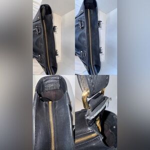 -Good shape, with signs of normal wear, visible scratches in some areas and some moderate wear to leather corners as shown in photos. The long shoulder strap is also torn, the strap is incomplete due to this reason, but the bag is still functional due to the two handles so can be used as a satchel bag, these imperfections are also shown in the photos.