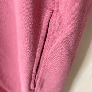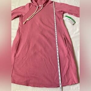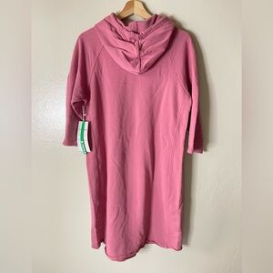 Soft pink dress with long sleeves. Features a cozy hood and drawstring.