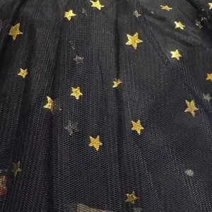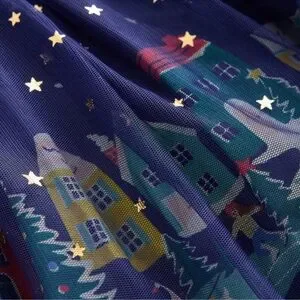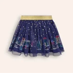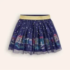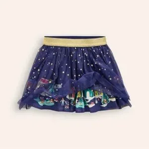 This enchanting skirt features a whimsical and festive night scene with gold stars set on two layers of tulle with holiday scene set on bottom layer. Perfect for adding a touch of Christmas magic to any outfit.
