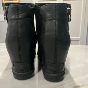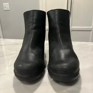 Chic and comfortable waterproof Sorel black leather ankle booties with a stylish hidden wedge. Features side zippers for easy wear. In GUC with some usage creasing as shown.