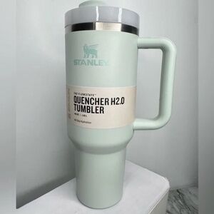 Stanley Quencher H2.0 FlowState Tumbler 40oz Color: Mist Brand new This travel tumbler is just what you need for all-day hydration. Take it with you to a high-intensity workout or on an extra-long commute to keep your drink cold for hours. The lid features a rotating cover with three positions: a straw opening, a wide mouth for drinking, and a full-cover top to prevent spills. The larger size even fits comfortably in your vehicle’s cup holder and comes with a rugged handle for carrying. YOUR DREAM TUMBLER: Whichever way your day flows, the H2.0 FlowState tumbler keeps you refreshed with fewer refills. Double wall vacuum insulation means drinks stay cold, iced or hot for hours. ADVANCED LID CONSTRUCTION: Whether you prefer small sips or maximum thirst quenching, Stanley has developed an advanced FlowState lid, featuring a rotating cover with three positions: a straw opening designed to resist splashes with a seal that holds the reusable straw in place, a drink opening, and a full-cover top for added leak resistance. We've also included an ergonomic, comfort-grip handle, so you can easily carry your ice-cold water to work, meetings, the gym or trips out of town. EARTH-FRIENDLY DURABILITY: Constructed of 90% recycled BPA free stainless steel for sustainable sipping, the Stanley Quencher H2.0 has the durability to stand up to a lifetime of use. Eliminate the use of single-use plastic bottles and straws with a travel tumbler built with sustainability in mind. DISHWASHER SAFE: