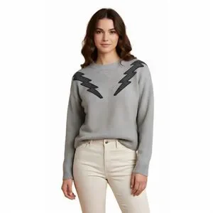 Wrap yourself in the cozy charm of the Storia pullover sweater, designed for those who love a touch of trendy flair. This gray beauty, crafted from a soft blend, features a striking lightning bolt graphic that adds a spark to your casual wardrobe. With its crew neck and long sleeves, it's perfect for those crisp fall days. Whether you're out for a coffee or lounging at home, this regular-fit sweater offers comfort and style. Plus, it's machine washable for easy care. New with tags, ready to elevate your everyday look!