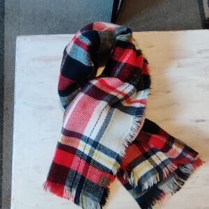 Bold plaid scarf by CeCe. Features red, black, yellow, and white. Adds flair to any look.