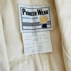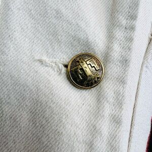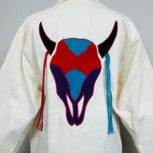 Stylish 100% cotton denim off white western duster jacket featuring a vibrant bull skull design on the back and rabbits foot charm on front by Pioneer Wear. The design includes red, blue, and purple sueded accents. Gold tone thunderbird buttons. Made in the USA