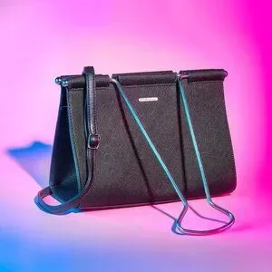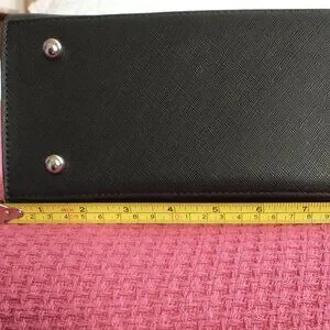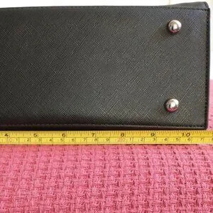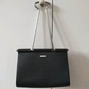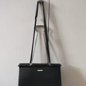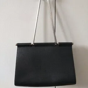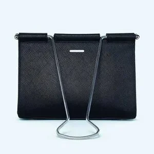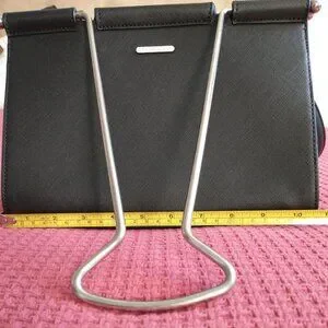 - Black with silver-tone metal hardware and "binder clip" handles (approximately 10" drop)