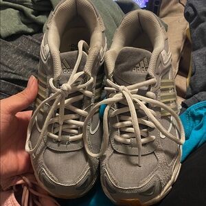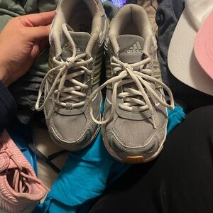 Adidas athletic shoes in gray with white accents. Features classic stripes.