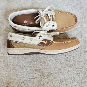 Margaritaville Womens Tan and White Boat Shoes with Moccasin Stitching. Size 8