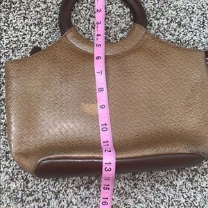 This vintage handbag is a unique and stylish accessory that adds a touch of bohemian chic to any outfit. The bag features a beautiful woven exterior in a rich, chocolate brown color, giving it a timeless and classic look. The most distinctive feature is the pair of smooth, dark circle handles, which provide a comfortable grip and a striking design element.