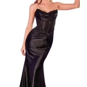 This stunning black prom dress features a sophisticated design perfect for any formal occasion. Its elegant silhouette and intricate detailing make it a standout choice for your special night.