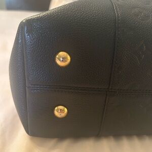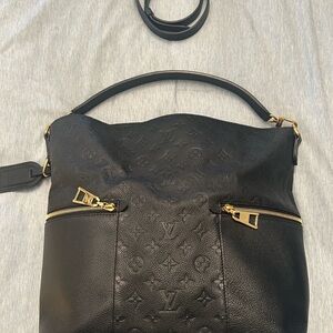 Chic black shoulder bag by Louis Vuitton. Features gold accents. Comes with crossbody strap. Bag in beautiful condition.