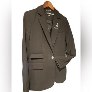 Chic black blazer featuring an Eiffel Tower and Bonjour embellishments. Perfect for a sophisticated look and a classic staple to any wardrobe. It is a size 4 and is NWT originally $159