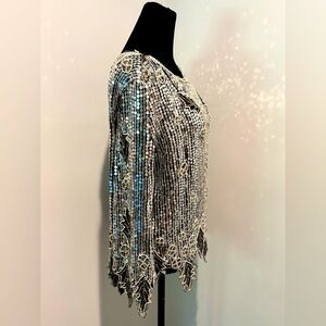 VINTAGE 80s Unbranded Black Silver Sequined Beaded Leaf Design Silk Lined Top M