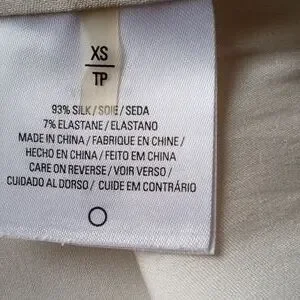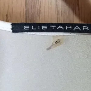 Elie Tahari, size XS,. 93% silk,. 7% elastane open V-Neck pull over shirt. This has long sleeves, and elastic at wrist with lacy detail. The front is a light taupe, with cream accent fabric at collar. Splits up each side and is a high low hem.