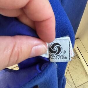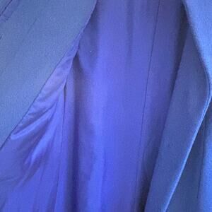This is a beautiful vintage long coat in a very pretty blue. It was recently dry-cleaned. No stains. There are a couple very small spots or wear (not holes) on one of the arms. Not noticable.