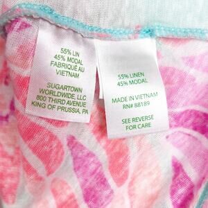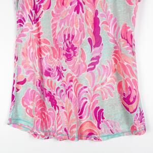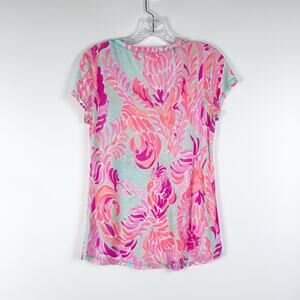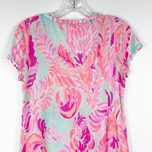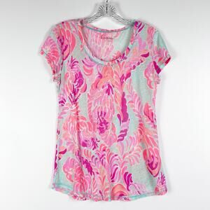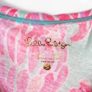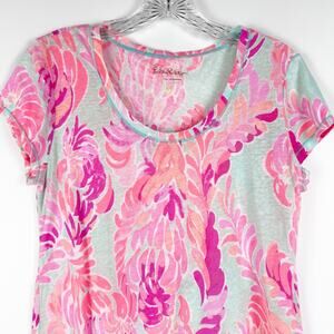 Lilly Pulitzer Sarah womens top in Love Birds print. Multicolor pink and mint green print on lightweight top. Linen/modal blend. Short sleeved relaxed fit. Size small. Excellent used condition. No flaws detected. See measurements for proper fit.