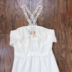 Elegant white maxi dress. Features halter neckline. Flowy and lightweight fabric. Perfect for summer occasions.