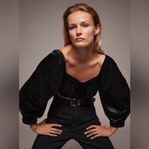 Zara Black Velvet Off Shoulder Puff Sleeve Crop Top Blouse Size Small NWT
