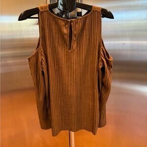 Soft and comfy brown blouse with ribbing and cold shoulders. Very pretty on. Perfect for versatile styling. Pre-loved item. Size 2 in Chicos is size Us 12.